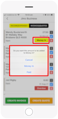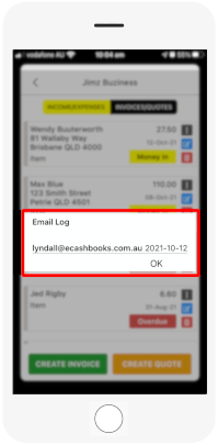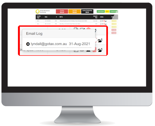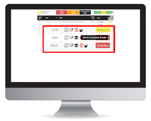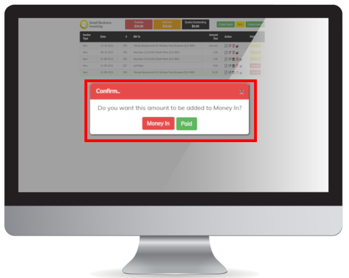 Confirmation dialog to confirm 'Money In' or 'Paid' Status Multiple actions including 'View PDF', Send Overdue Emails & 'Email Log' are now visible                     Email Log