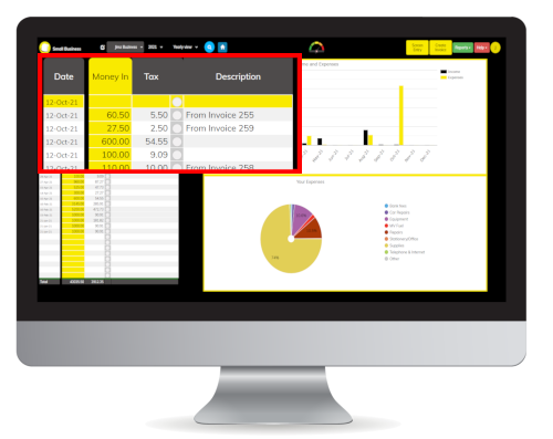 Invoicing area.  When your customers pay their invoices, you will be asked whether you would like the amount posted to the Money In area.  If you do the cashbook will automatically record the amount with the Invoice number in Money In.  If not, it will be the same as the current way of doing it, the invoice just gets marked Paid.  If you are using the Money In option be careful not to duplicate your receipts.